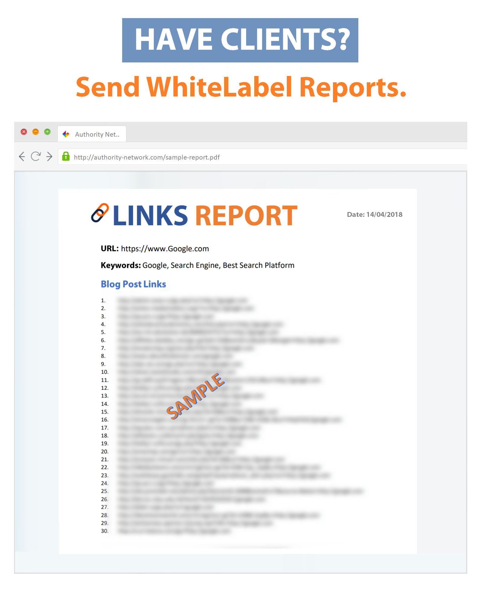Get detailed reports containing live blog post URLs in an organized and clean White-label PDF Report. Impress your clients with an awesome report :) |
